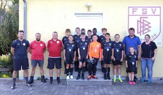 Der Waldthurner Metalltechniker Florian Stubenrauch (Zweiter von rechts) übergibt in Beisein der beiden Trainer Stefan Schütz (Zweiter von links) und‚ Sebastian Maier (links) einen Trikotsatz an die C- / D-Jugend des FSV Waldthurn / DJK Neukirchen zu St. Chr..