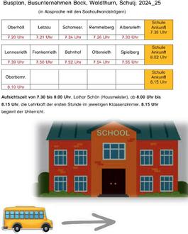 Der Busplan für die morgendlichen Abfahrtszeiten wurde versandt und befindet sich neben anderen informierenden Materialien zusätzlich im elterlichen Downloadbereich des Schulmanagers.