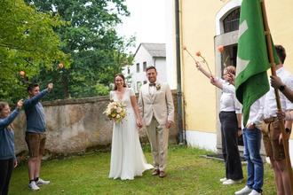Bereits am 28. Juni hatte das Paar im festlichen Ambiente des Lobkowitzschlosses in Waldthurn standesamtlich vor dem Waldthurner Bürgermeister Josef Beimler geheiratet. Der Polterabend mit Freunden fand zuvor bei der Brauerei Scheuerer in Moosbach statt. Gefeiert wurde nun – vielleicht auch mit einem Schluck Starkbier – am Sperberhof in Walpersreuth bei Püchersreuth.
