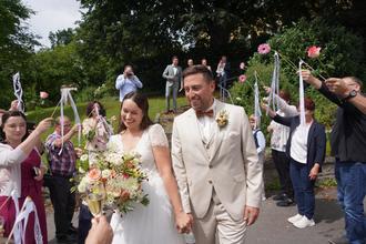 Die musikalische Gestaltung der Trauung übernahm der Waldthurner Chor amicanti unter der Leitung von Manuela Grünauer. Begleitet von Annika Pankotsch am E-Piano und Alexandra Jaworski an der Gitarre, verliehen die Sängerinnen und Sänger der Zeremonie eine mitreißende Leichtigkeit. Ein kleiner Schmetterling, der sich in die Kirche verirrte und fröhlich durch das Kirchenschiff flatterte, wurde dabei zum poetischen Sinnbild der Freude. Die Liebe zur Heimat und zueinander sind bei Franziska und Markus tief verwurzelt.