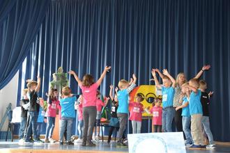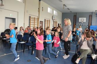 Im Anschluss sangen alle Vorschulkinder noch einmal das Lied vom „Lebendigen Wasser“, das sich zu einem richtigen Ohrwurm entwickelt hatte. Begleitet wurden sie dabei von Sonja Kick (Gitarre) und Martina Lorenz (Akkordeon). Bevor es die Abschluss-Urkunden und kleine Schultüten für jedes Kind gab, kletterten die Mädchen und Buben auf vorbereitete Bänke, um dann gemeinsam wieder hinunter zu springen. Keiner war Erster, keiner war Letzter – gemeinsam geht es jetzt auf den nächsten Schritt in die Zukunft. Zum Song „Wir sagen Tschüss und Auf Wiedersehn“ zeigten die Kids stolz ihren fleißig geübten Abschlussschlusstanz.
