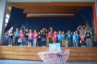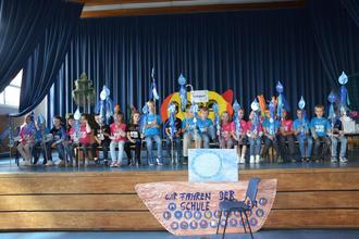 Aufgrund des leicht trüben Wetters wurde die Feier kurzerhand in die Turnhalle der Grundschule verlegt und so zogen am Nachmittag des 30. Juli die „Vorschulis“ mit Kita-Leitung Sonja Kick und Erzieherin Martina Lorenz zu den Klängen von „Yellow Submarine“ in die Turnhalle ein und bezogen Position auf der großen Bühne, die mit Korallenbänken, Schiffen und Eisschollen dekoriert war – begleitet vom rhythmischen Klatschen ihrer Familien. Lauthals erklang dann das Lied „Wir sind die Schulanfänger und warten nicht mehr länger“, während die Erziehrinnen aus der Roten und Blauen Gruppe jedem Kind seinen Wassertropfenstab überreichten.