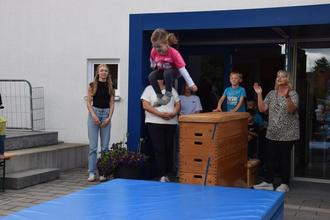 Danach durften sich die Familien auf den Vorplatz der Kita begeben, um ihr – jetzt- Schulkind in Empfang zu nehmen. Nacheinander sprangen – im wahrsten Sinne des Wortes - die Mädchen und Buben von einem Sprungkasten aus der Kita ins „Wasser“ (Weichbodenmatte). Ein symbolischer Sprung an ein neues Ufer – die Schulzeit.