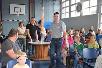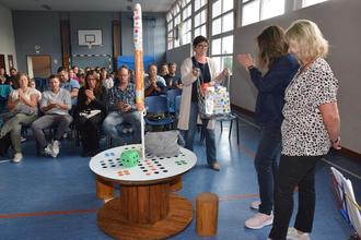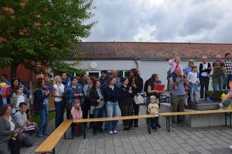 Dieser hieß seinerseits alle willkommen und bedankte sich beim gesamten Team für das vergangene Kita-Jahr. „In der Vergangenheit gab es ja immer ein Abschiedsgeschenk von den Vorschulkindern“, so Müller. Lange habe man überlegt, was es dieses Jahr werden soll. Aus verschiedenen Ideen kristallisierte sich dann ein überdimensionales „Mensch-ärgere-dich nicht-Spiel“ heraus, das man – Dank Wetterfestigkeit und integriertem Sonnenschirm - auch im Freien spielen kann.