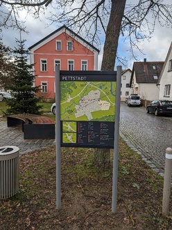 Die ISEK-Lenkungsgruppensitzung im September 2020 wurde für eine gemeinsame Besichtigung genutzt. Gerüstet mit Fahrrad und einer Aufgabenstellung fuhr man durch die Ortschaft, um sich die bestehenden Wegweiser aus Blick eines ortsfremden Besuchers anzusehen: „Welche Schilder gibt es? Sind alle wichtigen Orte verzeichnet? Kann ich mich orientieren, wenn ich zuvor nie in Pettstadt war? Welche Hinweise müssen ergänzt werden?“ Schnell war klar: an verschiedenen Stellen muss nachgebessert werden. So sollen zum Beispiel neue Infotafeln am Parkplatz an der Bachbrücke oder auch am Ortsausgang zwischen Markuskirche und Fähre entstehen. Im Ort sollen Sammelwegweiser die derzeit an verschiedenen Zäunen und Laternen angebrachten Wegweiser bündeln und so die Orientierung für Besucher erleichtern. Wichtig war auch die Erneuerung der Begrüßungsschilder an den Ortseingängen. Diese sollten neugestaltet und mit einer Hinweistafel für Veranstaltungen ergänzt werden. Im Dezember 2020 wurde die Grundkonzeption des neuen Besucherleitsystems fertiggestellt, das im April 2021 dem Gemeinderat vorgestellt und dessen Umsetzung in derselben Sitzung einstimmig beschlossen wurde. So wurde im Herbst 2021 die grafische Gestaltung an das Fachbüro eckedesign aus Potsdam vergeben.