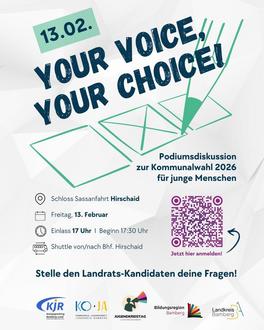 Unter dem Motto "Your Voice, Your Choice!" laden Kreisjugendring Bamberg-Land, Kommunale Jugendarbeit, Jugendkreistag und Bildungsregion Bamberg junge Wählerinnen und Wähler im Landkreis Bamberg zu einer Podiumsdiskussion ein. Dort haben alle jungen Menschen die Möglichkeit, den Landrats-Kandidaten im Vorfeld zur Kommunalwahl 2026 ihre Fragen zu stellen und in direkten Kontakt mit den Politikern zu treten.