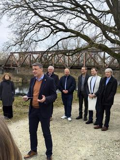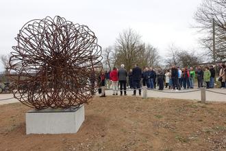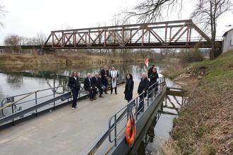 Im Anschluss übernahm Pfarrvikar Dominik Stehl die Segnung und weihte das Fährgelände offiziell ein. Nach dem symbolischen Banddurchschnitt enthüllte Frau Dr. Schmitt vom Flussparadies Franken zusammen mit der Künstlerin Angelika Summa den „Hydrophyt“. Dieses Kunstwerk reiht sich in die Projektreihe „Kunstbegegnungen am Kanal“ ein und soll die Wasserströmung bzw. den -kreislauf als verbindendes und gleichzeitig trennendes Element darstellen. Die Fertigung aus Stahl und Draht spiegelt sich im Gierseil der Fähre wider und auch durch die dortige Eisenbahnbrücke, über die bis heute Baustahl transport wird. Zusätzlich wird Pettstadt durch den berühmten Schmied seit jeher mit Metall in Verbindung gebracht.