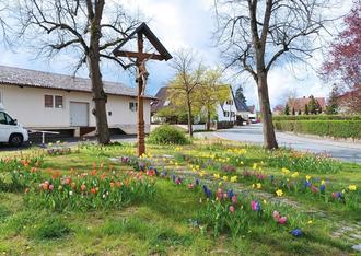 Dank der Pflanzaktion des OGV im Herbst 2022 verschönern heuer kunterbunte Frühlingsblumen das Umfeld am Kreuz bei der Raiffeisenbank