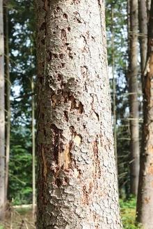 Einbohrlöcher in der Rinde weisen auf einen Befall mit dem Borkenkäfer hin.
