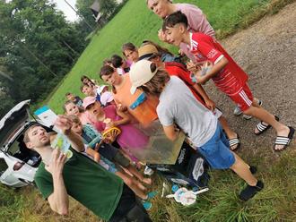 Bei wechselhaftem Wetter nutzen die Kinder eine Regenpause, um zusammen mit Jugendleitern, Fischereiaufseher und der Lehrerin Frau Kühhorn das Lehrplanthema „Wasser als Lebensraum für Tiere und Pflanzen" live zu erkunden. Angler kennen die Fischarten, die Pflanzen und Kleintiere in und um die Gewässer am besten.