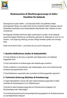 Zur Unterstützung der Eigenvorsorge stellt der Landkreis Bamberg im Rahmen seiner laufenden Informationskampagne zur Klimaanpassung eine Checkliste zur Überflutungsvorsorge im Keller bereit. Die Checkliste hilft dabei, systematisch zu prüfen, ob das Gebäude ausreichend gegen Überflutung und Rückstau geschützt ist. Dabei geht es nicht nur um Technik – auch Lagerung, Wartung und das richtige Verhalten spielen eine wichtige Rolle.