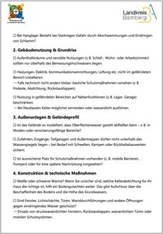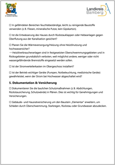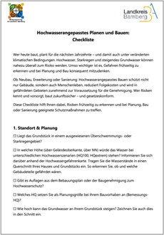 Zur Unterstützung der Eigenvorsorge stellt der Landkreis Bamberg im Rahmen seiner laufenden Informationskampagne zur Klimaanpassung eine Checkliste für hochwasserangepasstes Planen und Bauen zur Verfügung. Sie richtet sich an Bauherren, Planer und Architekten und führt Schritt für Schritt durch zentrale Vorsorgemaßnahmen: von der Standortwahl über die Gebäudegestaltung bis hin zu baulichen Schutzmaßnahmen, Geländeanpassungen und Versicherungsschutz.