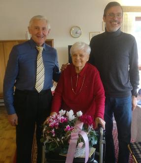 Anlässlich des 100. Geburtstages von Frau Maria Hoffmann überbrachten Bgm. Alois Kling und dritter Bgm. Joachim Leitenmayer die herzlichsten Glückwünsche. Zu Ehren der ältesten Bürgerin der Gemeinde Aichen spielte Bgm. Kling auf dem Akkordeon neben einem Geburtstagslied auch weitere Volkslieder, welche die Jubilarin textsicher und mit kräftiger Stimme mitsang.