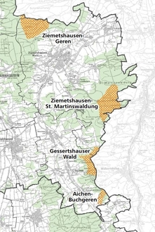Im Süd-Osten Gemeindegebiet Ziemetshausen und Osten Gemeindegebiet Aichen: Lobers Holz, Ebene und Hölldesgehau-Kreuzgehau (Bezeichnung Gessertshauser Wald)