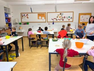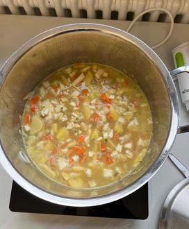 Zuerst wurde fleißig gewaschen, geschält und geschnitten. Im großen Topf kochten Kartoffeln, Karotten, Sellerie und Lauch weich. Anschließend ließen sich alle die Suppe richtig gut schmecken. Vielen Kindern schmeckte es so, dass sie sich einen Teller nach dem anderen holten. Ein Schulkind sagte sogar: „Die Suppe müssen wir unbedingt daheim nachkochen!“ So macht Schule Spaß!