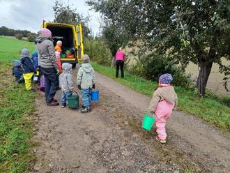 Gemeinsam wurden die Äpfel gesammelt und zusammen mit ihren Eltern besuchten die Kinder die Saftpresserei Danner in Kirchheim. Mächtig stolz auf das Ergebnis, 240 kg Äpfel ergaben 140 Liter Saft, bekam jedes Kind 5 Liter leckeren Apfelsaft mit nach Hause.