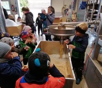 Auf Einladung von Christina Maier, aus der Elternschaft der „Pfiffis“ konnten die Kinder den gesamten Herstellungsprozess des Apfelsafts erleben.