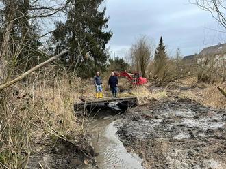 Das Bild zeigt (von links) Bauhofleiter Wolfgang Reif und den ersten Bürgermeister Ralf Wetzel am Lauterbach.