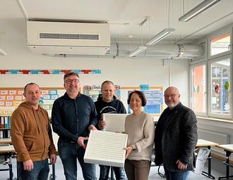 Auf dem Bild zu sehen von links: Wolfgang Reif (Markt Ziemetshausen), Christian Fischer (Fischer Haustechnik GmbH), Stefan Fischer (Hyazinth-Wäckerle-Grundschule), Alexandra Hahn (Hyazinth-Wäckerle-Grundschule), Bürgermeister Ralf Wetzel (Markt Ziemetshausen)