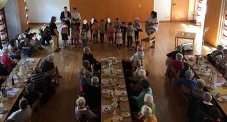Die Pfarrei St. Peter und Paul Ziemetshausen hat am 9. Mai zum monatlichen Begegnungsnachmittag ins Pfarrheim eingeladen. Passend zum Monat Mai stand diesmal der Nachmittag unter dem Thema „Muttertag“. Pfr. Bernhard Endres begrüßte die zahlreichen Besucher mit einführenden Gedanken zum Muttertag. Nach Kaffee und selbstgebackenen Kuchen überraschten die Kindergartenkinder die zahlreichen Besucher mit netten Liedern wie z.B. ein „Vogel wollte Hochzeit machen“, begleitet von Gitarre und Trommel. Eifrig klatschen die Kinder und die Besucher bei den Liedern im Takt mit. Am Ende ihres Programms verteilten die kleinen Gäste mit Freude und Begeisterung an alle Besucher des Nachmittags ein kleines Muttertagsgeschenk der Pfarrei mit der Aufschrift „Schön, dass es dich gibt“. Zum Abschluss bedankte sich Pfr. Endres bei den kleinen Gästen und ihren Betreuern, mit einem kräftigen Applaus und der Bitte, bald wieder zu kommen.