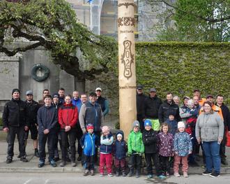 Unser Bild zeigt die Feuerwehrkameraden am dem mit Schnitzereien verzierten Stamm des Maibaums nach getaner Arbeit.