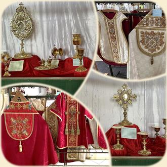 Bemalte Holzministranten luden schon am Kirchenaufgang mit einem „Herzlich Willkommen“ zur Kirchenausstellung ein. So nutzten zahlreiche Menschen die Gelegenheit tägliches und nicht alltägliches in der wunderschönen, barocken Pfarrkirche zu entdecken. Die Besucher bestaunten gotische und barocke, reich bestickte und auch ganz einfache liturgische Gewänder. Diese waren in den verschiedenen liturgischen Farben und in den bedeutendsten Formen ausgestellt. Künstlerisch gefertigte Kelche und Meßgarnituren, Wettersegen, Gefäße für die hl. Öle von Taufe, Firmung und Krankensalbung und die Monstranz waren in einer großen Glasvitrine ausgestellt. All dies konnte mit den dazugehörenden Erklärungen bestaunt werden. Ein Rauchmantel, damit Größe und Umfang sichtbar wurden, war liegend im Altarraum ausgebreitet.
