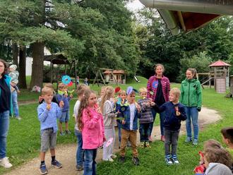 „Auf dem langen Weg, bist du nicht allein, weil Gott selber spricht: Ich will bei dir sein“, sangen die Kinder des Kindergartens St. Ulrich in Aichen im Abschlussgottesdienst des zu Ende gehenden Kindergartenjahres. Auch Pfarrer Bernhard Endres, der die Andacht zelebrierte, griff diesen Gedanken auf, als er die kindgerechte Formulierung des Psalm 91 vorlas. Für die dreizehn Kindergartenkinder, die im September in die Schule kommen, hat die Metapher des Weges eine besondere Bedeutung. Im Gottesdienst gestalteten sie einen Weg mit Dingen, welche sie an ihre Kindergartenzeit erinnern. Als Zeichen, dass Gott den Weg aller Menschen mitgeht, wurde jedem Kindergartenkind am Ende der Andacht ein selbst gestalteter Engel ausgeteilt. Im Anschluss des Gottesdienstes trafen sich die Kinder mit ihren Familien, dem Elternbeirat und dem Kindergartenteam im Garten des Kindergartens. Die Vorschulkinder und deren Eltern schenkten dem Kindergarten ein selbst gebautes Hochbeet, in dessen Erde die Kinder aussäen und anpflanzen können, was sie sich vorstellen.
