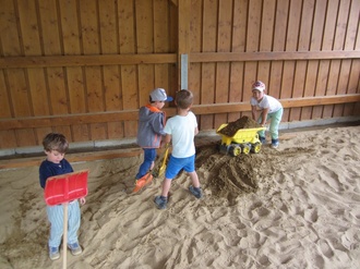 Die unmittelbare Nähe zur Baustelle inspiriert die Kinder vor allem dazu, im großen Sandkasten selber aktiv zu werden. Unterstützt durch die Anschaffung neuer Sandspielsachen und –fahrzeuge, finanziert vom Erlös des Bienenfestes im Mai 2025, wird der Sandkasten nahezu täglich zur Großbaustelle.