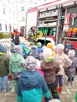 Bei einem Besuch der beiden Feuerwehrmänner mit den Einsatzfahrzeugen bei uns im Kinderhaus, erklärten sie uns was sich in einem Feuerwehrauto befindet. Wir durften sogar die Sirene hören und im Feuerwehrauto sitzen.