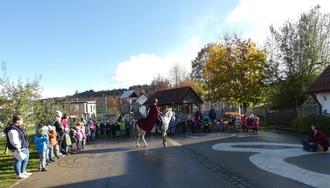 Am Donnerstag, den 10.November gab es eine Überraschung für die Kinder des Kindergartens Ettenbeuren. Als sich die Kinder und das Team am Vormittag auf dem Parkplatz vor dem Kindergarten zum Martinslieder-Singen getroffen haben, kam auf einmal ein Bettler her und setzte sich daneben auf den Boden. Und während die Kinder den armen Mann verwundert anschauten, ertönte plötzlich ein Hufgetrappel. Alle hielten den Atem an: Es kam doch tatsächlich St. Martin auf seinem Pferd zu uns geritten! Und so sahen wir gebannt zu, wie Martin mit dem Bettler sprach, wie er Mitleid mit ihm hatte und seinen warmen roten Mantel auszog, um ihn mit seinem Schwert zu teilen und die Hälfte davon dem frierenden Mann zu schenken. Natürlich sangen wir St. Martin ein Martinslied vor, worüber er sich sehr freute. Er bedankte sich herzlich bei uns und ritt davon. Am Abend war es dann so weit, nach einer zweijährigen Unterbrechung durften wir wieder gemeinsam mit den Familien St. Martin feiern! Dafür trafen wir uns in der Kirche in Ettenbeuren zur gemeinsamen Martinsandacht, bei der wir uns an den Heiligen Martin erinnerten. Vor allem aber erinnerten wir uns daran, wie wichtig es auch in der heutigen Zeit ist, füreinander da zu sein, aufeinander Acht zu geben, einander zu unterstützen, Mitgefühl zu haben und uns gegenseitig Wärme zu schenken…