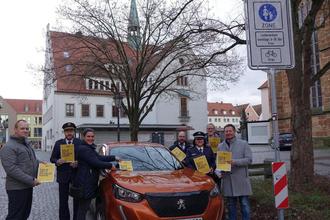 Jetzt gibt es erst mal eine Gelbe Karte! Von links: Tommy Dörner (Leiter des ruhenden Verkehrs beim Zweckverband), Polizeioberrat Wolfgang Schüler (Leiter Polizeiinspektion Neumarkt), Simone Reinhardt (Komm. Geschäftsführerin des Zweckverbands), Oberrechtsrat Andreas Werner (Stadt Neumarkt), Susanne Braun (Verkehrssachbearbeiterin der PI Neumarkt), Daniel Gottschalk (Leiter des Ordnungsamtes) und OB Thomas Thumann.