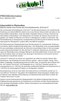 "Echt kuh-l!"-Team. Der bundesweite Schulwettbewerb „Echt kuh-l!" des Bundesministeriums für Landwirtschaft, Ernährung und Heimat (BMLEH) startet in eine neue Runde. Diesmal dreht sich alles um die Artenvielfalt im Ökolandbau. Unter dem Motto „Expedition Wiese und Acker: Erforsche die Artenvielfalt im Ökolandbau!“ sind Schülerinnen und Schüler der Klassen drei bis zehn eingeladen, die Vielfalt von Pflanzen und Tieren im ökologischen Landbau zu erforschen. Der Schulwettbewerb zur ökologischen Landwirtschaft und Ernährung wird im Rahmen des Bundesprogramms Ökologischer Landbau (BÖL) des BMLEH ausgelobt.