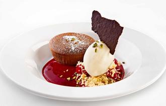 Dessert: Biscuit surprise -Schokoladen-Küchlein mit flüssigem Pistazienkern auf Himbeer-Mark, dazu Frankensekt-Sorbet.