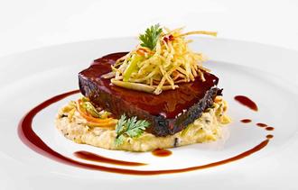 Hauptgang: Bœuf à la mode - Geschmorte Rinderschulter mit Burgunder-Jus, Trüffelcreme, Gemüsejulienne und Kartoffelstroh.