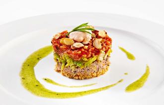 Vorspeise: Tartelettes de salade - Linsen, Tomaten, Oliven, Rauchmandeln und "Fromage frais" auf fränkischem Knusperbrot mit Estragon-Vinaigrette.