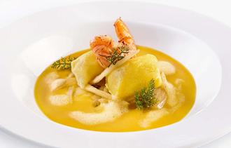 Zwischengang: Bouillabaisse de lègumes - Safran-Frankenwein-Cremesuppe mit Bärlauch-Kartoffelkissen, geschmortem Fenchel und gebratener Garnele.