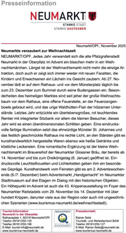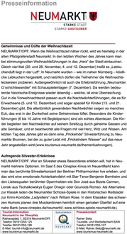 Amt für Touristik der Stadt Neumarkt i.d. OPf. Jedes Jahr verwandelt sich die alte Pfalzgrafenstadt Neumarkt in der Oberpfalz im Advent ein bisschen mehr in ein Weihnachtsmärchen. Längst ist der Weihnachtsmarkt nicht mehr die einzige Attraktion, doch auch er zeigt sich immer wieder mit neuen Facetten, die Kindern und Erwachsenen ein Lächeln ins Gesicht zaubern. Ab 27. November lädt er auf dem Rathaus- und vor dem Münsterplatz täglich bis zum 23. Dezember zum Bummel durch seine Budengassen ein. Besonderheiten des heimeligen Marktes sind seit jeher der große Weihnachtsbaum vor dem Rathaus, eine offene Feuerstelle, an der Feuerzangen- bowle gebraut wird, und das urige Waldhütten-Flair der hölzernen Unterstände. Letztes Jahr entzückte ein überlebensgroßes, rot leuchtendes Rentier mit integrierter Sitzbank vor allem die kleinen Besucher, dieses Jahr wird es einen überdimensionalen Schlitten geben. Eine eindrucksvolle farbige Illumination setzt das ehrwürdige Münster St. Johannes und das festlich geschmückte Rathaus ins rechte Licht, an den Ständen gibt es kunsthandwerklich hergestellte Waren ebenso wie heiße Getränke und köstliche Leckereien. Eine romantische Ergänzung ist der kleine Weihnachtsmarkt im Brauereihof der Neumarkter Glossner Bräu, der noch bis zum Dreikönigstag (6. Januar) geöffnet ist. Eindrucksvolle Leuchtsilhouetten und Lichterketten geben ihm ein besonderes Gepräge. Kunsthandwerk vom Feinsten gibt es am 2. Adventswochenende (6./7. Dezember) beim Adventsmarkt „Handgemacht“ im Neumarkter Stadtmuseum auf drei Etagen im Dialog mit den historischen Objekten. Ein Höhepunkt im Advent ist auch die 43. Krippenausstellung im Foyer des Neumarkter Reitstadels vom 29. November bis 14. Dezember mit über hundert Krippen, darunter viele aus der Region oder auch mit ungewöhnlichen Szenerien (www.tourismus-neumarkt.de/weihnachtsstadt).