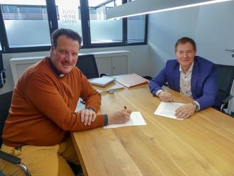 Pfarrer Stefan Wingen und Oberbürgermeister Thomas Thumann bei der Unterzeichnung des Kaufvertrages.