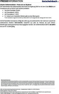Ab fünf bestellten Exemplaren erfolgt die Lieferung versandkostenfrei. Der Code kann sowohl bei telefonischen (Hotline: 0800-8585085, kostenfrei aus allen dt. Netzen), als auch Online- Bestellungen (www.gutscheinbuch.de) angegeben werden. Der Schlemmerblock 2024 ist ab sofort bis zum 01.12.2024 gültig.