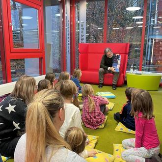 „Vorlesen verbindet Generationen“: In der Stadtbibliothek nahm Ralf Mützel, Leiter des Amtes für Nachhaltigkeit die Kinder auf eine spannende Reise ins Weltall mit, um einen Blick auf die Erde aus einer anderen Perspektive zu nehmen.
