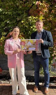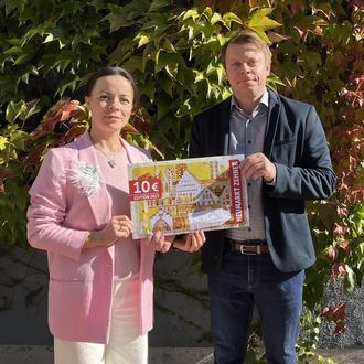 Die Künstlerin Olga Borovska und City-Manager Christian Eisner stellen die Jahresedition 2025 des Neumarkt Zehners vor.