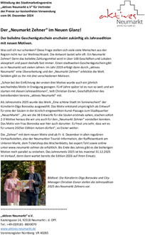 „aktives Neumarkt“ e.V. Was soll ich nur schenken? Diese Frage stellen sich viele viele Menschen aus der Region nicht nur zur Weihnachtszeit. Die Antwort lautet sehr oft: Ein Neumarkt Zehner! Denn das beliebte Zahlungsmittel wird in über 100 Geschäften und Lokalen akzeptiert und passt deshalb fast immer. Einen stadtweiten Geschenkgutschein gibt es in Neumarkt seit vielen Jahren. Im Jahr 2019 erfolgt dann durch „aktives Neumarkt“ eine Überarbeitung und der „Neumarkt Zehner“ erblickte die Welt. Seitdem gibt es ihn mit drei verschiedenen Motiven.