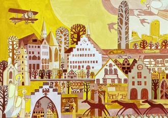 Als Jahresmotiv 2025 wurde das Werk „Eine schöne Stadt im Sonnenschein“ der Künstlerin Olga Borovska ausgewählt. Das Motiv entstand ursprünglich als Entwurf für eine der Säulen in der kürzlich eingeweihten Kunst-Passage zum Stadtquartier „NeuerMarkt“. „Als wir die 38 Entwürfe für die Säulen erstmals sahen, stachen sofort 2-3 Motive heraus die wir uns auch für den „Neumarkt Zehner“ vorstellen konnten. Das Motiv von Frau Borovska war hier auch darunter. Es freut uns sehr, dass wir es für unsere 2025er Edition nutzen dürfen“, so Eisner weiter.