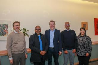 Ralf Mützel (Amt für Nachhaltigkeit), Conrad Poole (Bürgermeister Drakenstein), Oberbürgermeister Markus Ochsenkühn, Seraj Johaar (Direktor für wirtschaftliche Entwicklung und Stadtplanung) und Cindy Winter (Umweltmanagerin und Koordinatorin der Partnerschaft mit Neumarkt) (v.l.) freuen sich auf die Vertiefung der Klimapartnerschaft.
