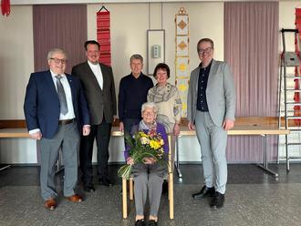 Neben OB Ochsenkühn freuten sich Tochter Christa, Sohn Wolfgang, Dekan Stefan Wingen und Georg Schlierf, der Vorstand der Baugenossenschaft Neumarkt (von rechts), mit der Jubilarin.