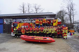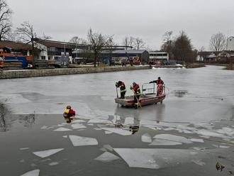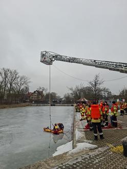 Feuerwehren des Landkreises Neumarkt i.d.OPf./Gottschalk. „Erst ab einer Eisdicke von 15 Zentimetern können Eisflächen auf Gewässern sicher betreten werden“, lautet eine Faustformel, mit der Hilfsorganisationen immer wieder auf die Gefahr des Einbrechens von Personen in vermeintlich zugefrorene Gewässer hinweisen. Berichte vieler Hilfsorganisationen zeigen jedoch, dass in jedem Winter immer Personen diese Faustregel missachten oder die Tragfähigkeit von Eisdecken falsch einschätzen. Dies häufig mit der fatalen Folge eines lebensbedrohlichen Einbruchs in das Gewässer. Um sich für derartige Einsatzlagen gezielt vorzubereiten und um verschiedene Rettungsmethoden auszuprobieren, trafen sich DLRG Neumarkt und einige Feuerwehren aus dem Landkreis am vergangenen Samstag zu einer Gemeinschaftsübung und -ausbildung am Ludwig-Donau-Main Kanal in Neumarkt. Ausbilder Alois Frank von der DLRG führte in die Ausbildung mit einem theoretischen Unterricht ein, in dem die verschiedenen Rettungsgerätschaften, die Eigensicherung der Einsatzkräfte und vor allem die medizinischen Besonderheiten bei der Rettung und Behandlung stark unterkühlter Personen behandelt wurden. In der anschließenden praktischen Rettungsübung wurden verschiedene Rettungstechniken beübt, um deren jeweilige Vor- und Nachteile herauszustellen. Neben einem Vorgehen über Leiterteile wurden auch ein Flachwasserschubbot sowie eine Drehleiter zur Rettung eingesetzt. Die vorgehenden Retter wurden dabei jeweils mit Schwimmwesten und Leinen vom sicheren Ufer aus gesichert. Hierbei bewährte sich die Zusammenarbeit beider Rettungsorganisationen bestens. Die Verantwortlichen von DLRG und Feuerwehr zogen ein positives Fazit der gemeinsamen Übung und Ausbildung, wenngleich alle Beteiligten hoffen, dass in dieser Wintersaison keine Eisrettungen durchgeführt werden müssen.