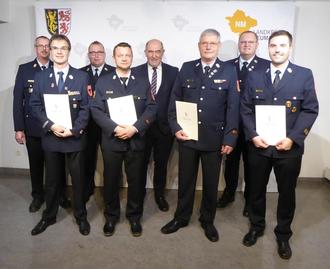 Christoph Schimpl (1. Reihe links) und Andreas Lang (1. Reihe rechts) wurden zu Kreisbrandmeistern ernannt. Benedikt Stauber (1. Reihe, 2.v.l.) und Gottfried Prskawetz (1. Reihe, 3.v.l.) erhielten Dankurkunden. Es gratulierten KBI Joachim Klein, KBI Christoph Knappe, Landrat Gailler und KBR Jürgen Kohl (2. Reihe v.l.).