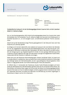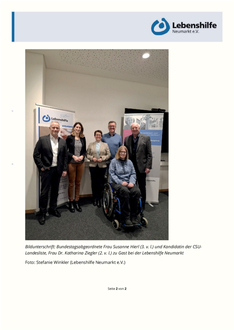 Lebenshilfe Neumarkt. Kurz vor den Bundestagswahlen 2025 erhielt die Bundestagsabgeordnete Frau Susanne Hierl sowie die Kandidatin der CSU-Landesliste, Frau Dr. Katharina Ziegler aus Neumarkt eine Einladung der Lebenshilfe Neumarkt e.V., um sich bezüglich sozial- und behinderten-politischer Themen auszutau- schen. Aktuell sind auf der Bundesebene einige Themen gesetzgeberisch in der Diskussion bzw. durch das Ampel-Aus auf „Stand-by“ gestellt. So erfolgte vor Ort bei der Lebenshilfe unter anderem ein Austausch über eine Reform der Werkstätten inkl. der angegliederten Neuordnung des Berufsbildungsbereiches, einer Neuordnung der Lohn- systematik für Menschen mit Behinderung in Werkstätten, der Reform des SGB VIII und damit verbunden die Verlagerung der sog. Eingliederungshilfe für Kinder mit einer geistigen Behinderung auf die Landkreise und ganz allgemein die Frage nach alternativen Lösungen bei wegfallenden Fördermitteln, insbesondere bei der Investition in Gebäude und Anlagen. Neben den durch die fiskalischen Rahmenbedingungen schwerer werdenden Zeiten, ist zuletzt auch im sozialen Bereich zu beobachten, dass aus bestimmten (unterschiedlichen) politischen Strömungen das bisherige System der Behindertenpolitik und der zugrundeliegende Inklusionsgedanke immer stärker in Frage gestellt werden. Auch diese Entwicklung war Thema des Gesprächs. Dr. Wilhelm Baur (1. Vorsitzender des Präsidiums), Claudia Franke (Präsidiumsmitglied und Vorsit- zende des Werkstattrats der JURA-Werkstätten gGmbH) sowie die drei Vorstände Andreas Moser, Stefanie Winkler und Andreas Dauer zeigten sich erfreut über den Besuch der Bundestagsabgeordneten Susanne Hierl sowie von Frau Dr. Katharina Ziegler und dem ausgesprochenen Interesse an der Arbeit der Lebenshilfe Neumarkt zum Wohle der Menschen mit Behinderung und deren Angehörigen in Deutschland, in Bayern und vor Ort in Neumarkt.