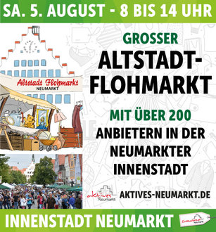 Fast schon traditionell organisiert „aktives Neumarkt“ e.V. am ersten Samstag im August den Neumarkter Altstadt-Flohmarkt. Dabei verwandeln sich, diesmal am 5. August, zwischen 8.00 und 14.00 Uhr große Teile der Neumarkter Innenstadt in eine bunte Kunst- und Trödelmeile. Da die Neumarkter Flohmärkte an den Jurahallen traditionell aufgrund des Juravolksfestes im August pausieren müssen, schließt der Altstadt-Flohmarkt in der Innenstadt die Lücke im Flohmarktkalender der Trödelfans. Die Obere Marktstraße wird an diesem Tag komplett für den Verkehr gesperrt sein, um den Besuchern ein entspanntes Bummeln zwischen den über 200 Flohmarktständen und den Geschäften zu ermöglichen. Der Untere Markt bleibt dabei für den Straßenverkehr geöffnet und die Parkplätze stehen zum größten Teil wie gewohnt den Besuchern des Bauernmarktes zur Verfügung, der zur gleichen Zeit stattfindet.