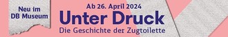DM Museum Nürnberg. Das DB Museum in Nürnberg wagt aktuell buchstäblich einen Blick über den Toilettenrand: Seit Ende April ist dort die neue Sonderausstellung „Unter Druck. Die Geschichte der Zugtoilette“ zu sehen. In acht Themenbereichen mit rund 150 Exponaten, Dokumenten und Fotografien wird die Entwicklung der Zugtoilette von den Anfängen im 19. Jahrhundert bis heute nacherzählt. Gezeigt werden unter anderem der Nachttopf aus Reichskanzler Otto von Bismarcks Salonwagen, ein Modell eines Fäkalien-Transportwagens, Toiletten in Original- und Miniaturgröße, ein zukunftsweisender Bioreaktor und viele Geschichten zum Schmunzeln.
